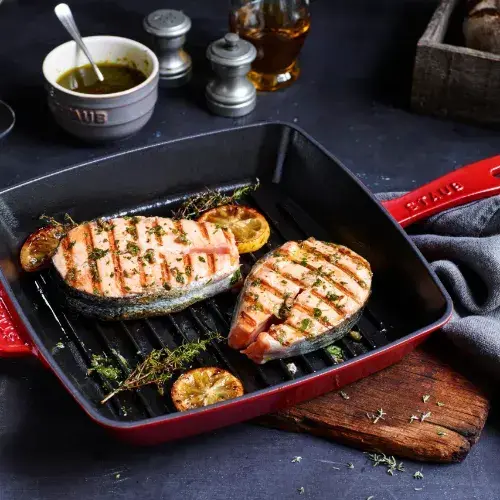 I recommend using the Staub cast iron grill pan for this chargrill aubergine recipe. The ridged surface creates the characteristic grill marks that make aubergine on grill look as good as it tastes, and the cast iron retains heat when the cold aubergine slices go in rather than dropping in temperature and losing the sear. The Staub’s black enamel interior handles the high heat needed for a proper char without any issue. For a grilled eggplant recipe where the char is everything, this is the right tool.