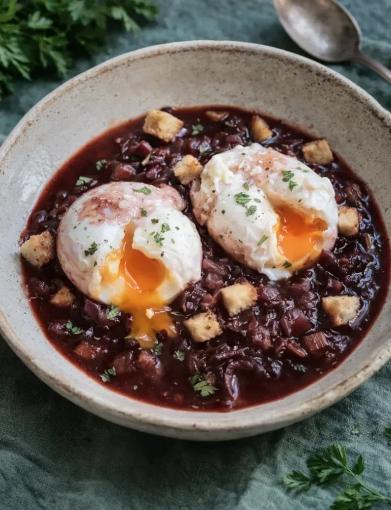 - Ladle the warm wine sauce into deep plates, you want a good pool of it. Place two poached eggs on top of the sauce in each bowl, and scatter the crispy croutons. If you're using parsley, sprinkle a bit over now.The whole point is the contrast: soft, wine-touched eggs against the rich, glossy sauce, with those crispy bits on top for texture.Serve immediately whilst everything's still warm and the yolks are runny.